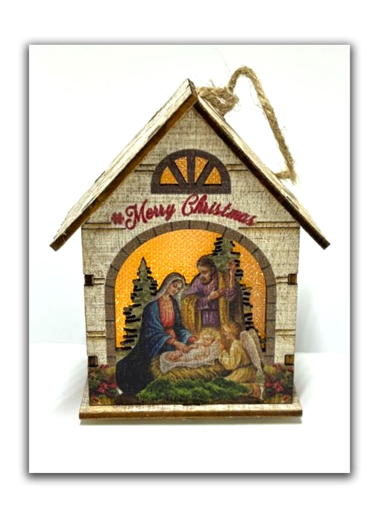 Com cordão para pendurar, é uma peça leve e fácil de colocar no pinheiro ou em qualquer cantinho decorativo. O detalhe “Merry Christmas” na parte superior completa o clima festivo, unindo beleza, tradição e espiritualidade em um único enfeite.