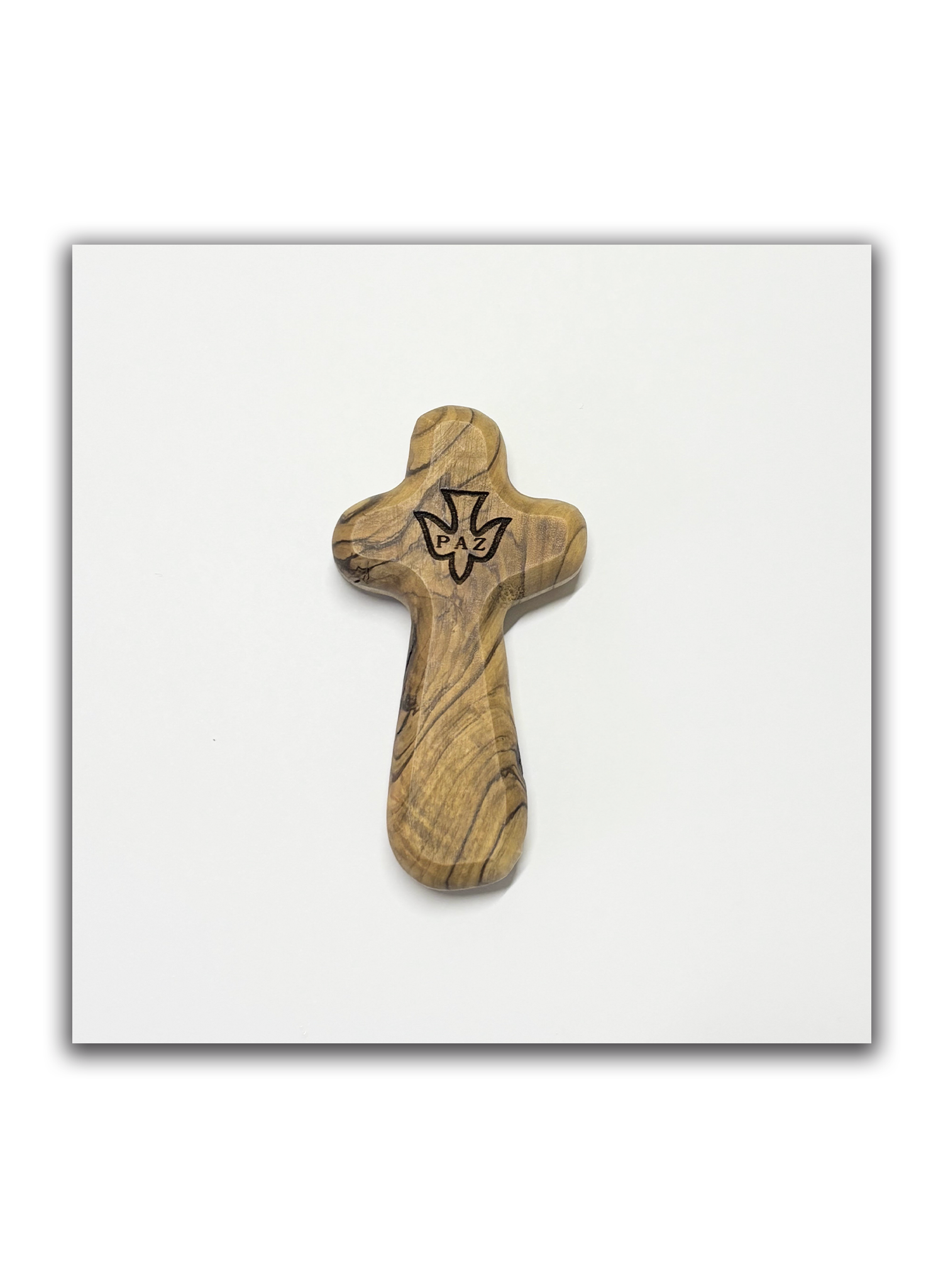 Cruz artesanal produzida na Terra Santa, em madeira de oliveira natural, com gravação da palavra PAZ no símbolo da pomba, sinal do Espírito Santo.
