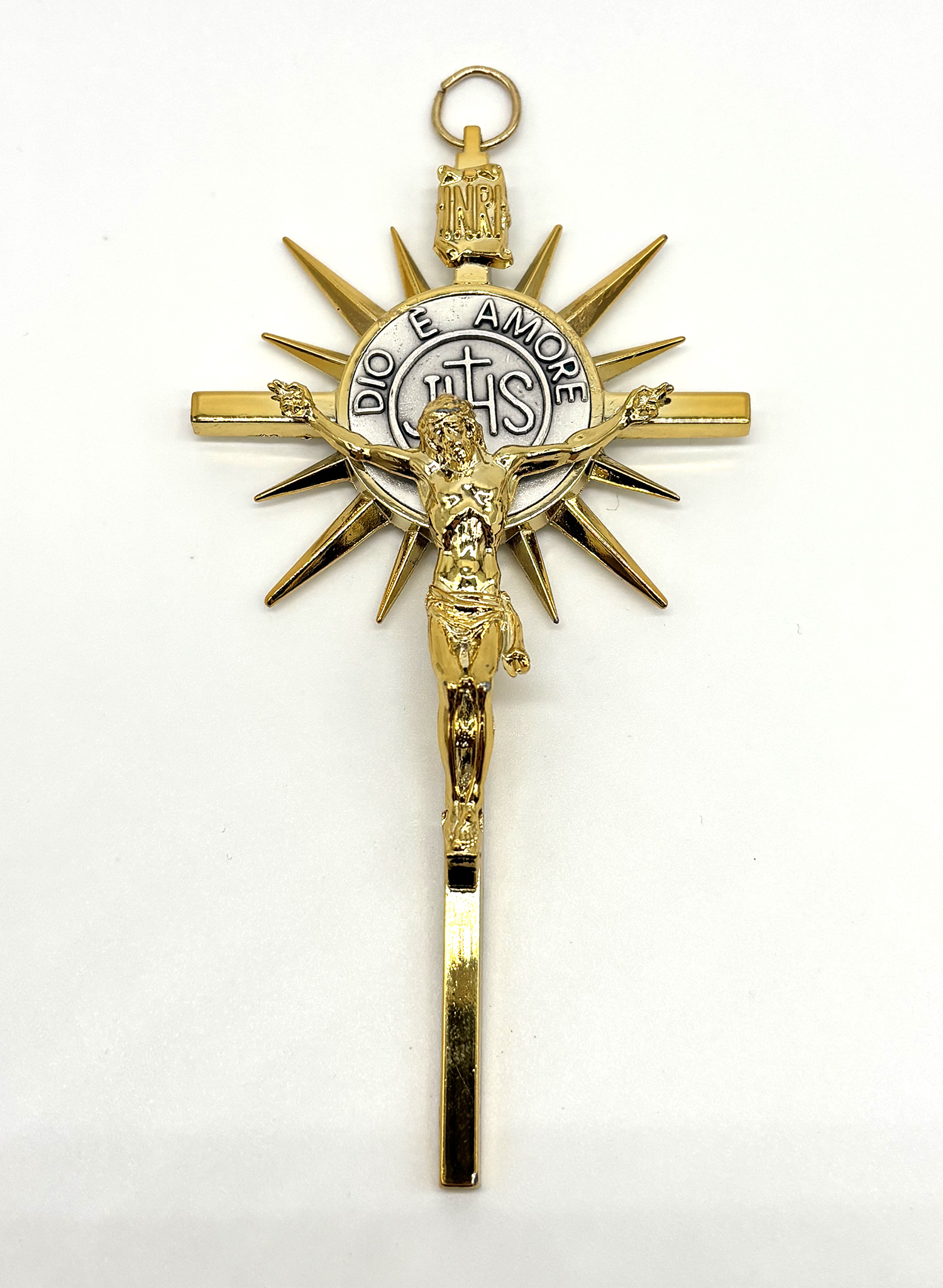 Cruz devocional em metal, especialmente pensada para assinalar o momento único da Primeira Comunhão. Com acabamento dourado, apresenta ao centro o símbolo eucarístico “IHS” e a inscrição “Dio è Amore”, destacando o coração da fé cristã.