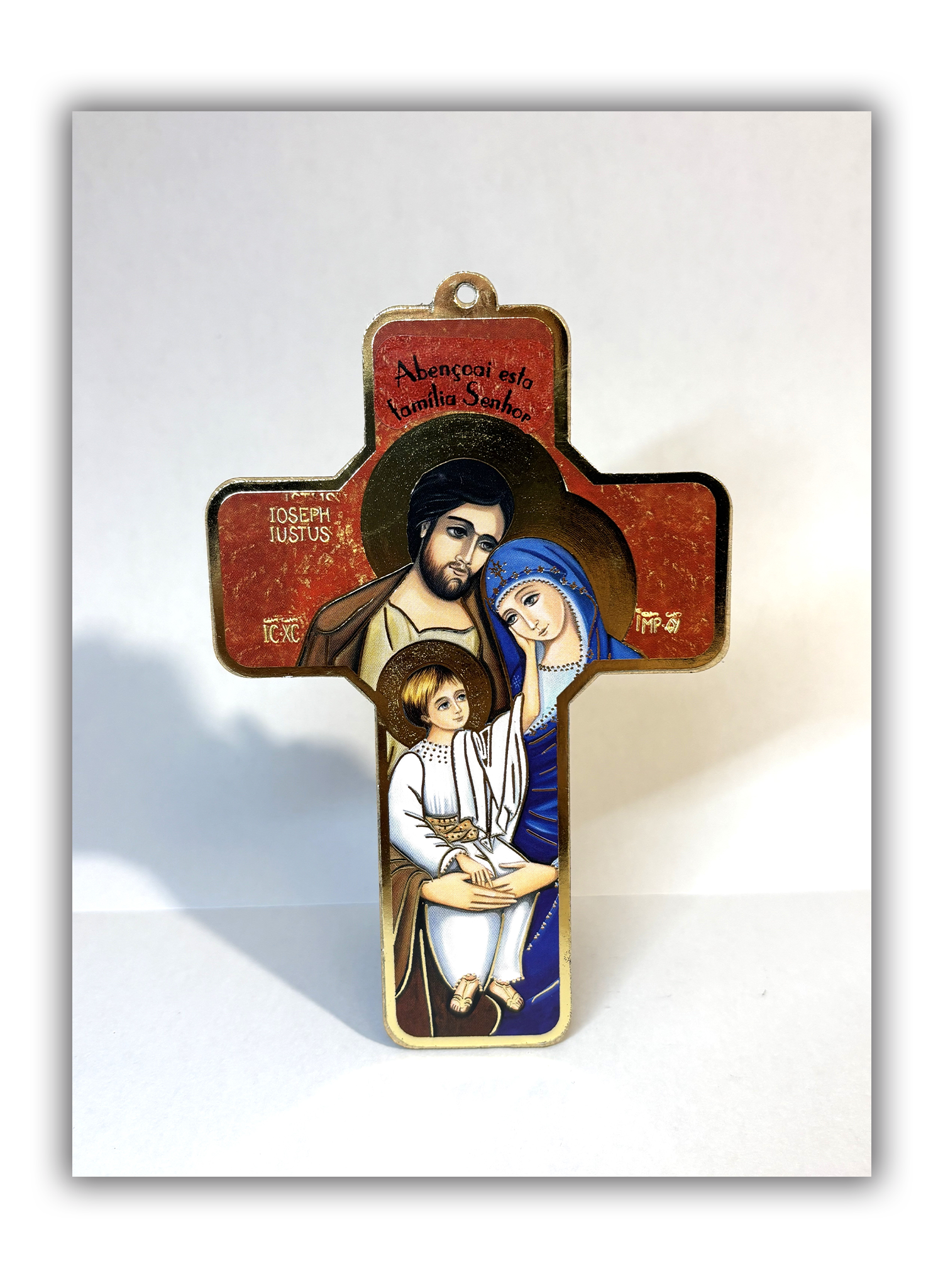 Cruz devocional em madeira com a imagem da Sagrada Família (Jesus, Maria e José), acompanhada da invocação: “Abençoai esta família, Senhor”.