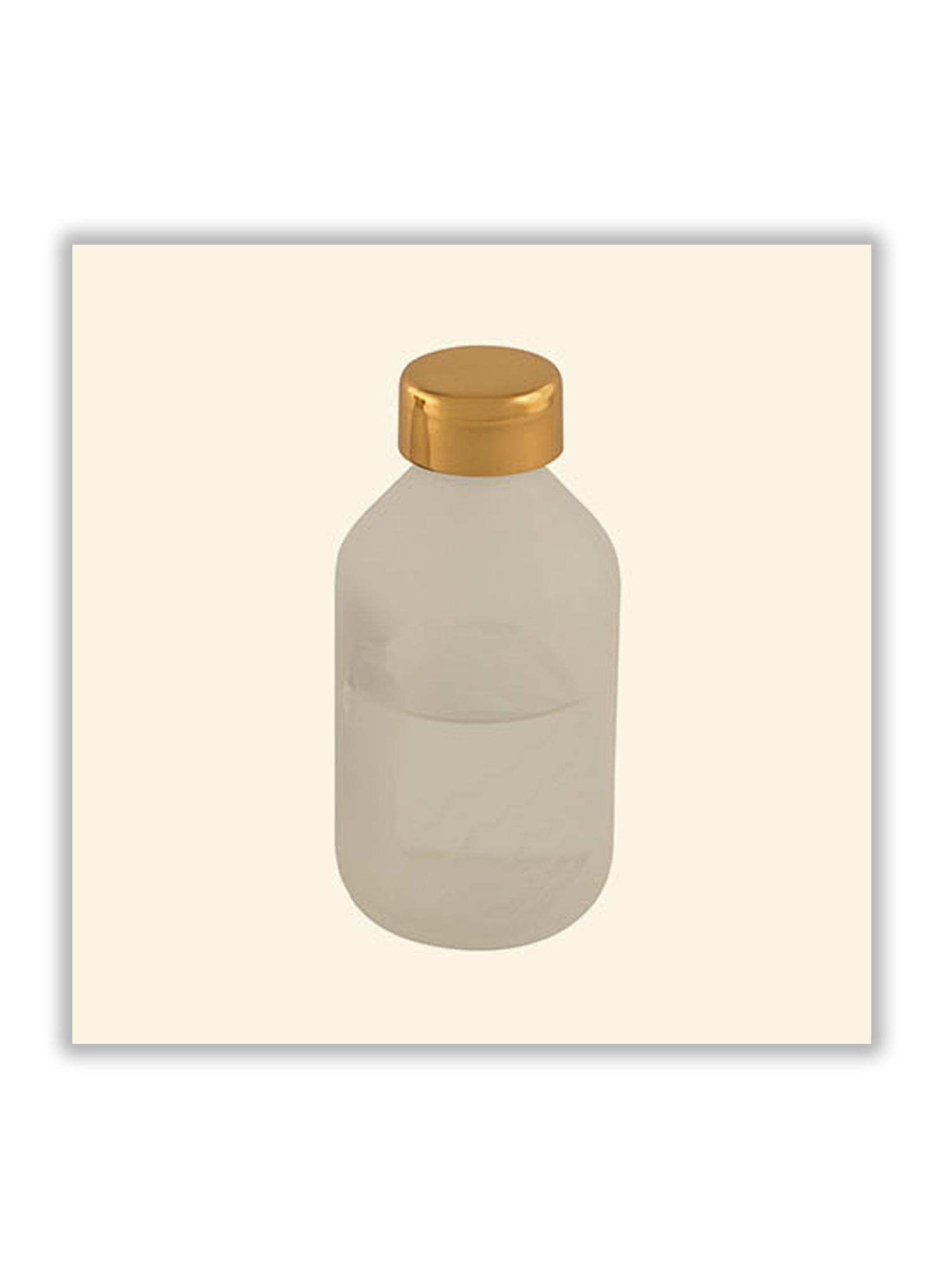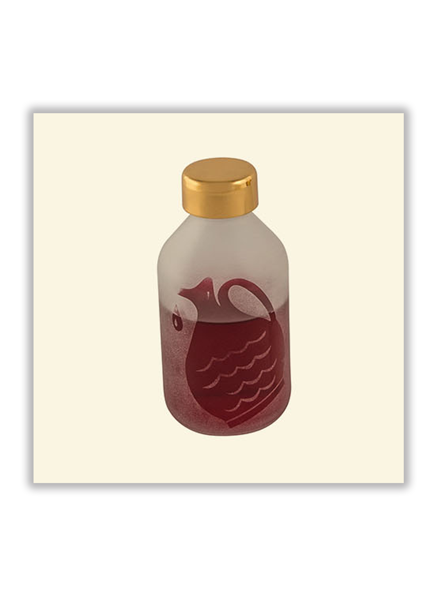 Frasco em vidro, com tampa em metal banhado a ouro ou a cromo e desenhado artesanalmente uma jarra (para água) e um cacho de uva (para vinho), com capacidade de 100 ml.