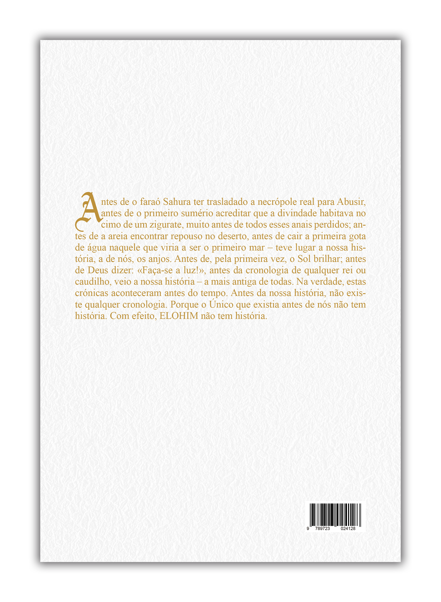 Antes de o faraó Sahura ter transladado a necrópole real para Abusir, antes de o primeiro sumério acreditar que a divindade habitava no cimo de um zigurate, muito antes de todos esses anais perdidos, antes de a areia encontrar repouso no deserto, antes de cair a primeira gota de água naquele que viria a ser o primeiro mar – teve lugar nossa história, a de nós, os anjos. Antes de pela primeira vez o Sol brilhar, antes de Deus dizer: «Faça-se a luz!», a mais antiga de todas as cronologias aconteceu, a nossa história, anterior a qualquer rei ou caudilho, veio a nossa história, a mais antiga de todas. Na verdade, estas crónicas aconteceram antes do tempo. Antes da cronologia, antes de qualquer cronologia. Porque o Único que existia antes de nós não existia sem história. Com efeito, ELOHIM não tem história.