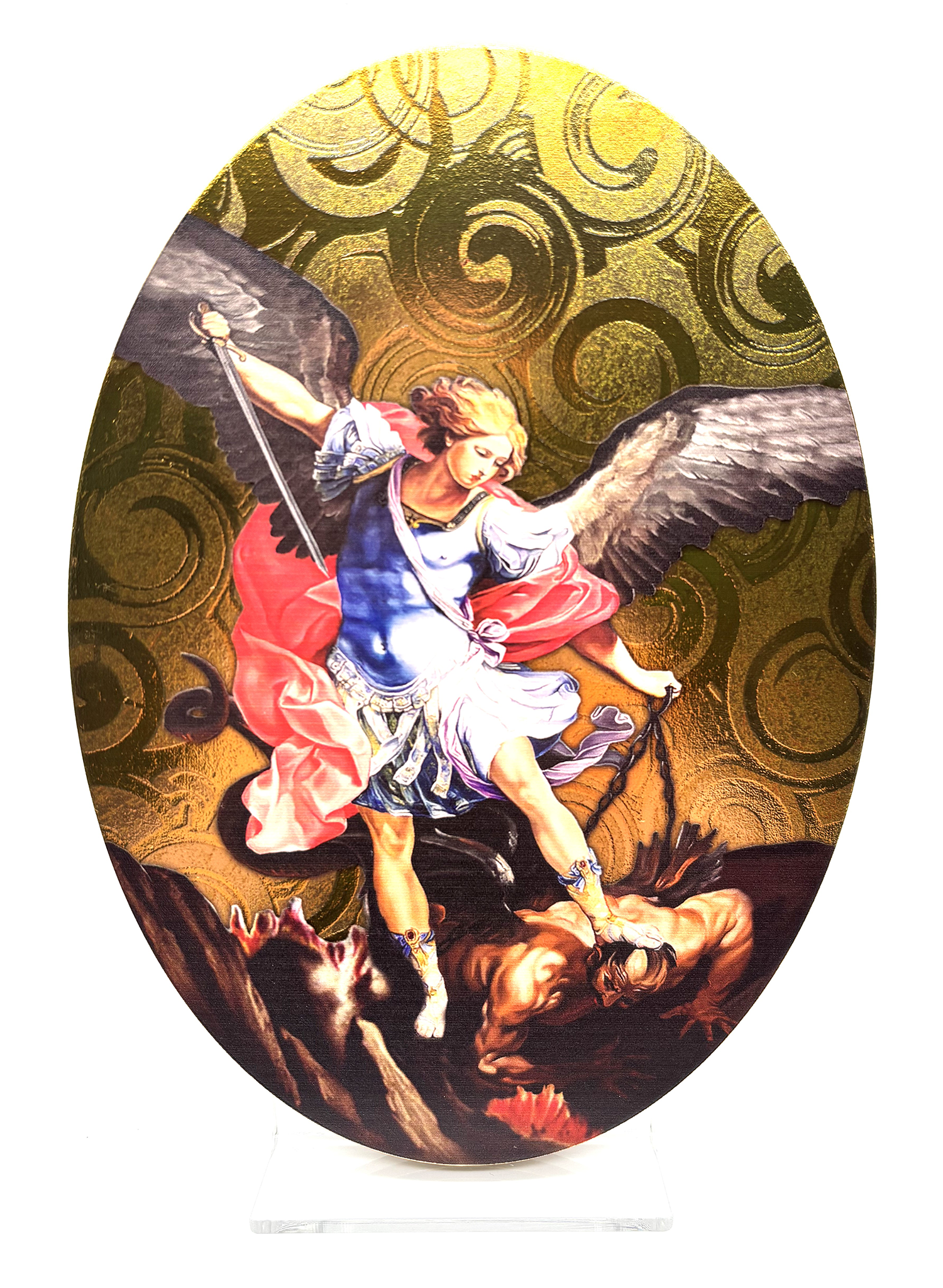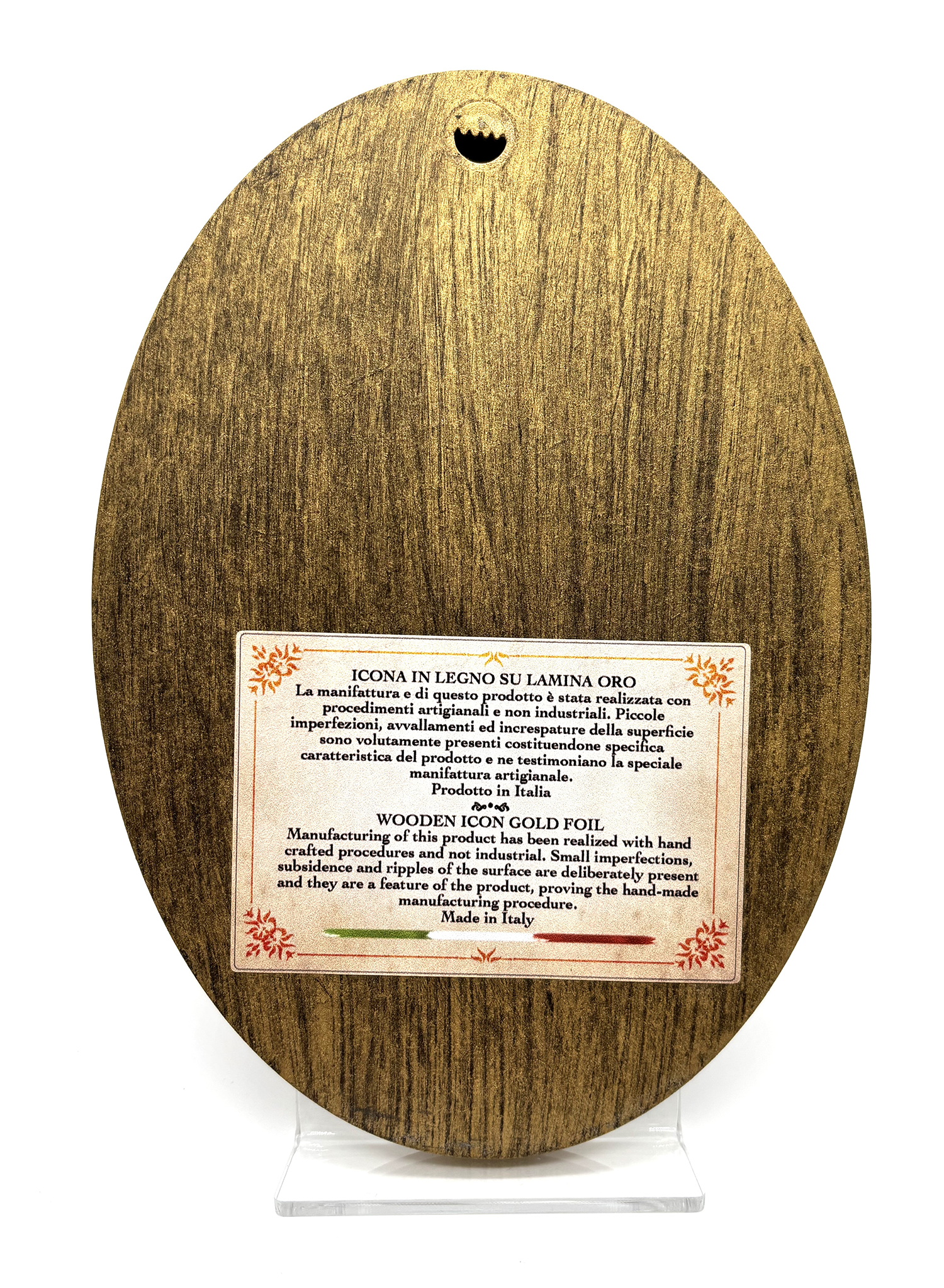 Este ícone religioso de formato oval é uma expressão harmoniosa da tradição cristã, unindo arte, fé e beleza num único objeto. Produzido em madeira e enriquecido com aplicação em folha de ouro, apresenta imagens de grande profundidade espiritual, inspiradas na iconografia clássica da Igreja.