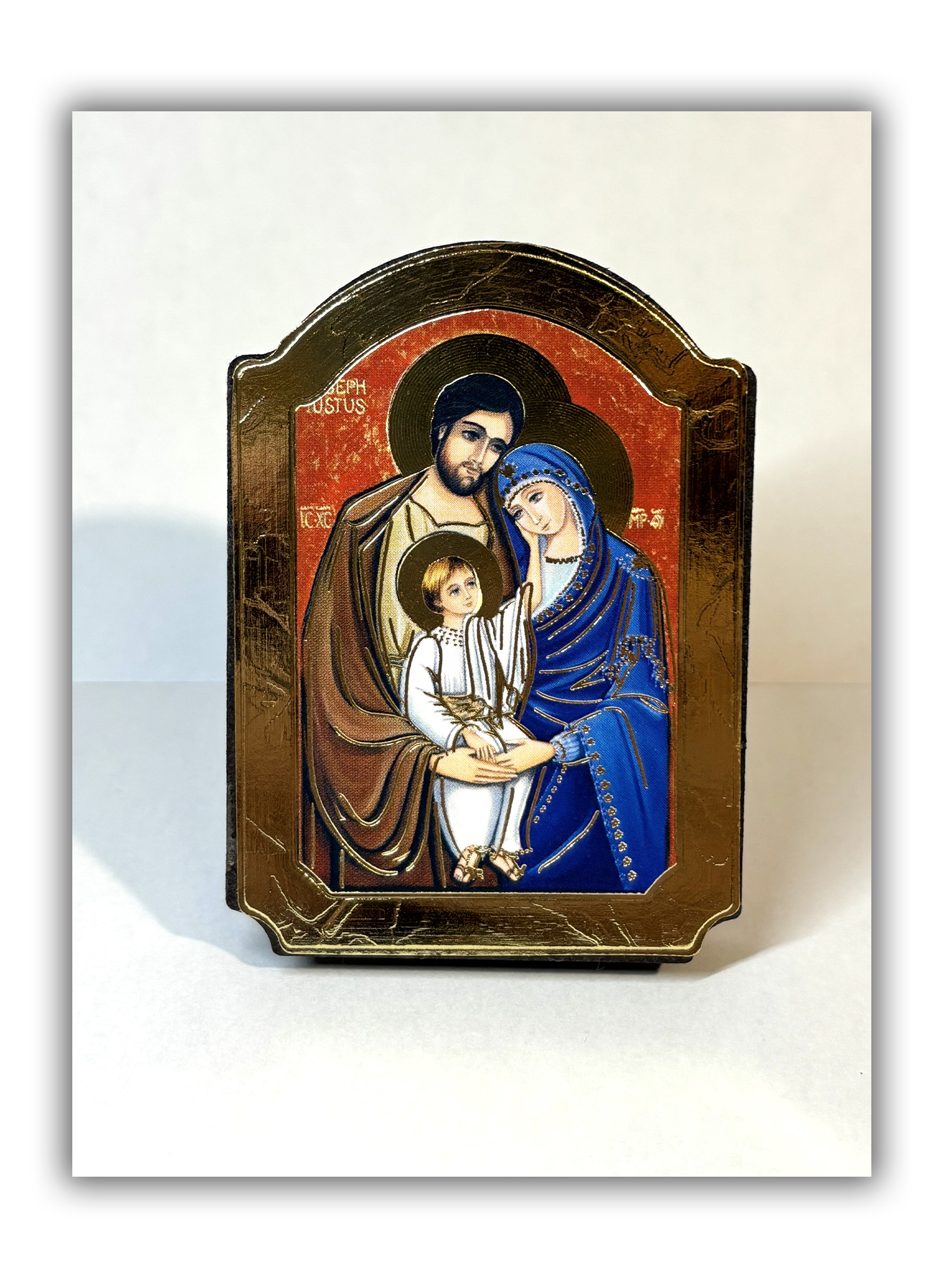 Este quadro apresenta a Sagrada Família em estilo iconográfico bizantino, transmitindo serenidade, amor e união. A imagem mostra São José, a Virgem Maria e o Menino Jesus em destaque, envoltos por tons quentes e detalhes que reforçam a dimensão espiritual da família de Nazaré.