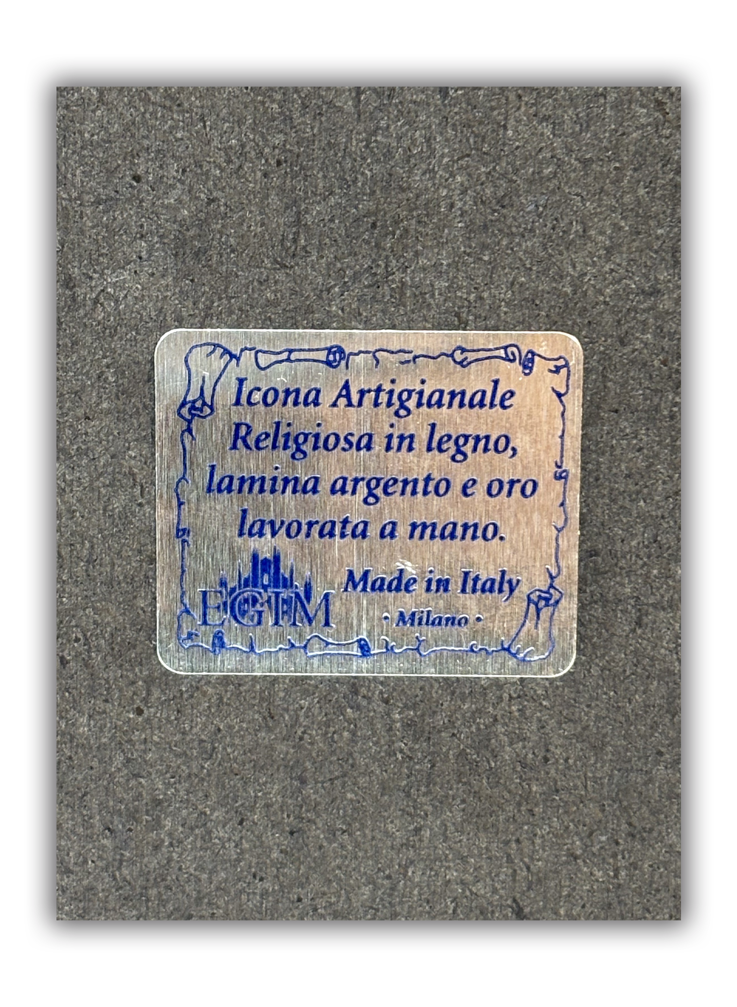 Ícone religioso artesanal em madeira, com lâmina de prata e ouro trabalhada à mão.