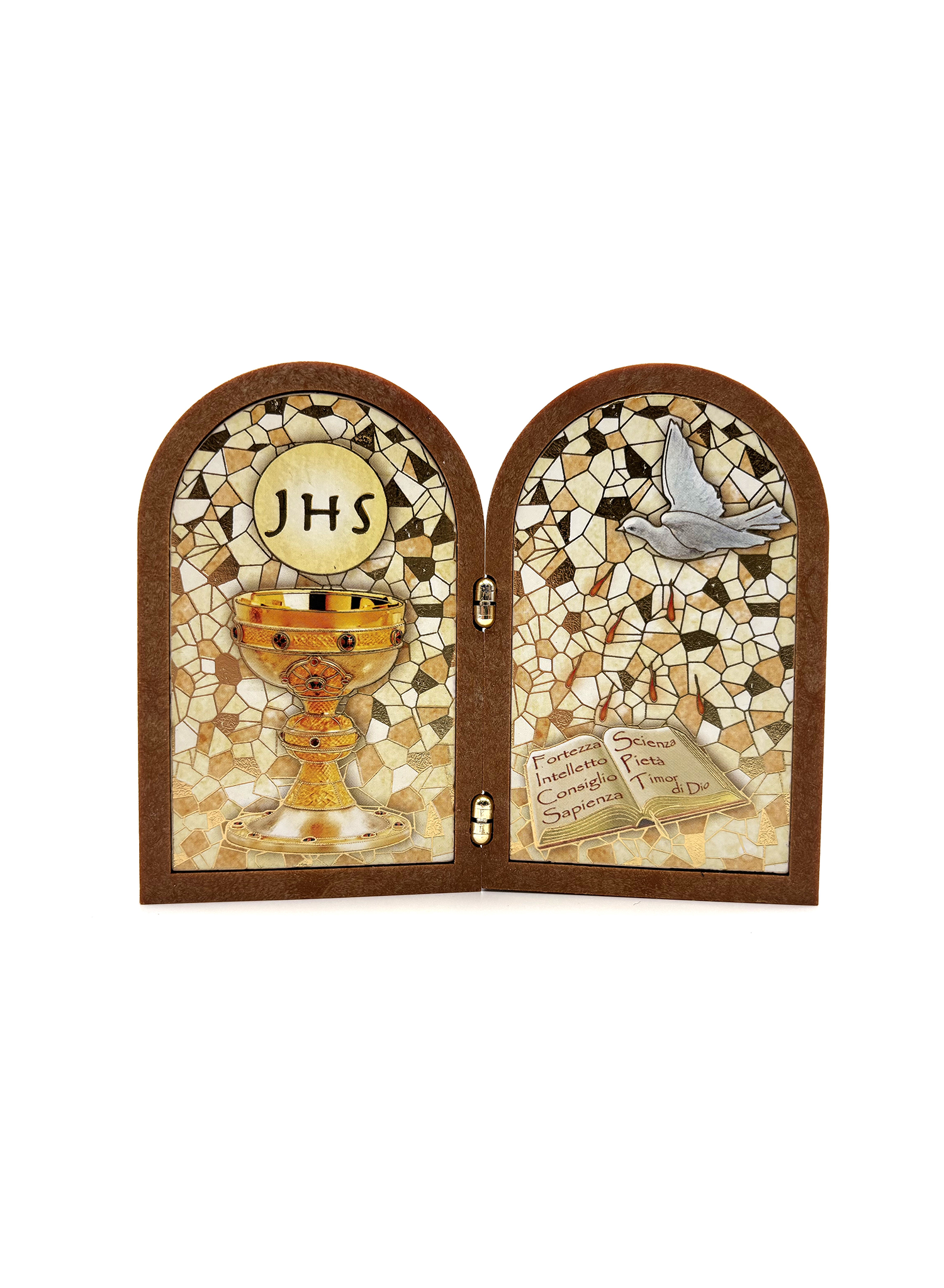 No lado oposto, a imagem da pomba representa o Espírito Santo, fonte de graça e santificação, iluminando o caminho do fiel. A base artística em estilo vitral confere beleza, profundidade e um sentido de transcendência à peça.