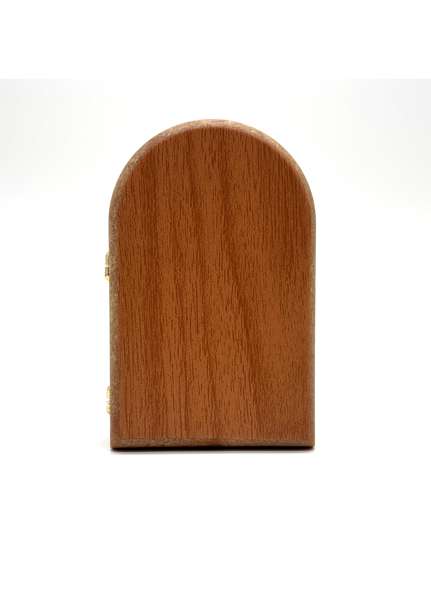 Oratório em madeira de traço clássico, pensado para criar um espaço de oração simples e profundamente significativo. Ao abrir, revela uma composição de forte simbolismo eucarístico: o cálice, sinal do sacrifício de Cristo, acompanhado da inscrição “IHS”, evocando o nome de Jesus presente na Eucaristia.