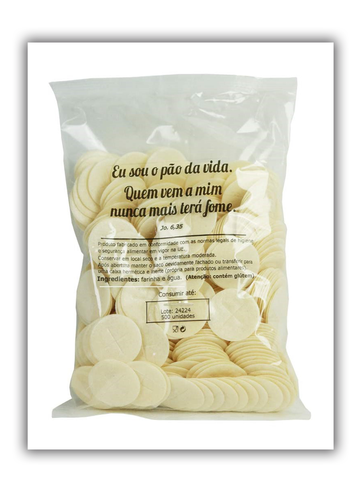Partículas pequenas para distribuição da Sagrada Comunhão aos fiéis. Embaladas em saqueta transparente com a citação bíblica: «Eu sou o pão da vida. Quem vem a mim nunca mais terá fome.» (Jo 6,35).