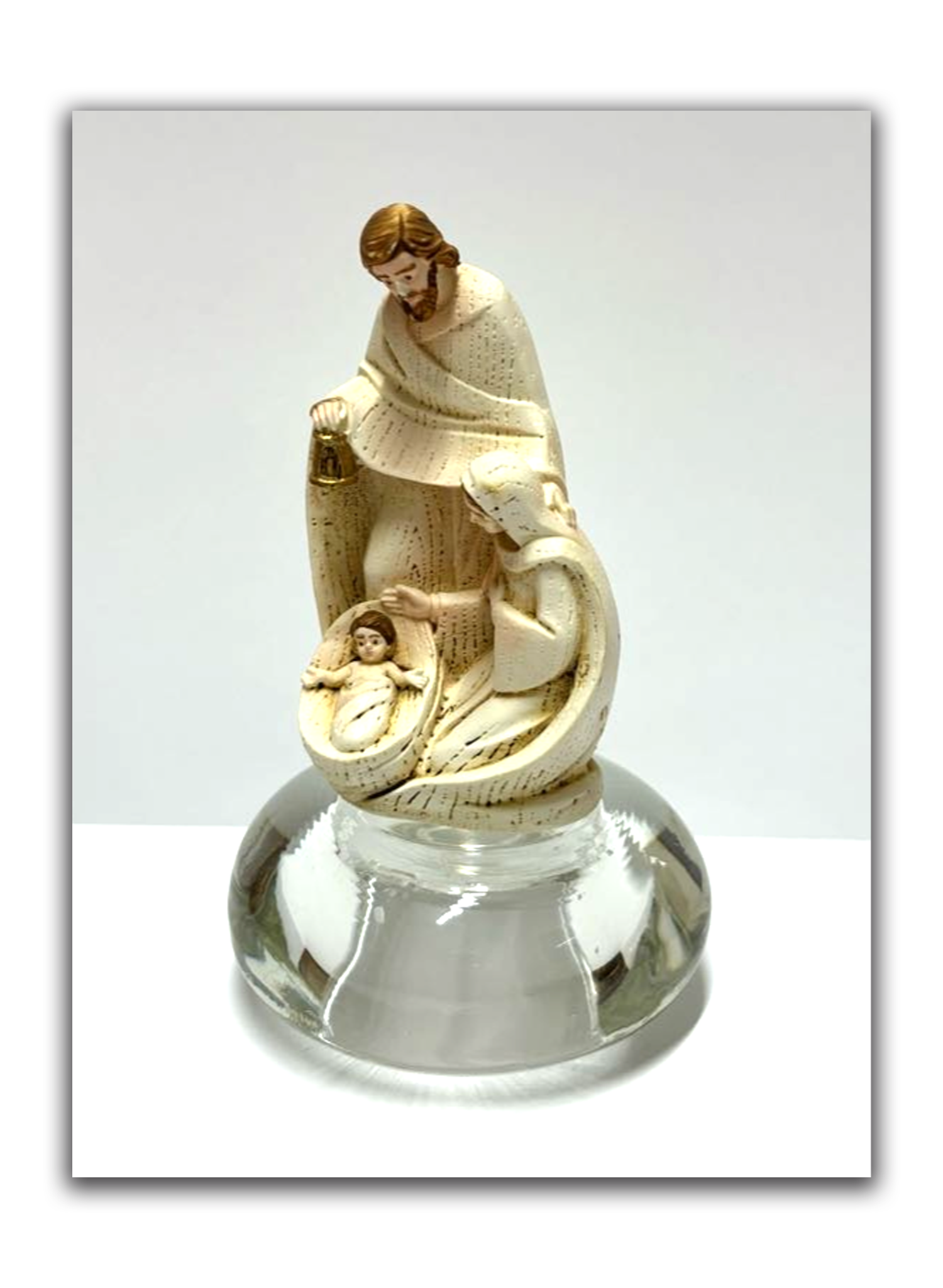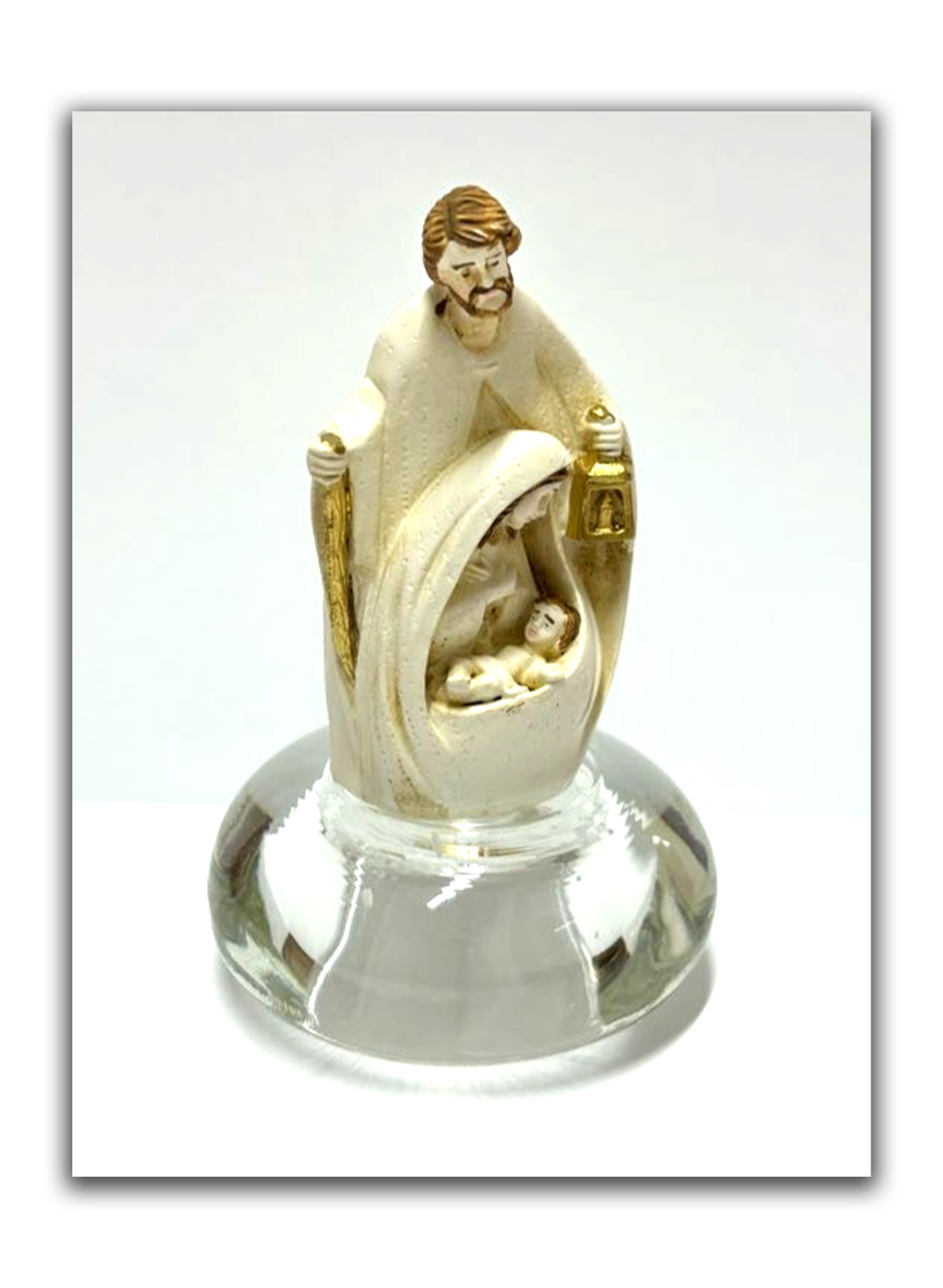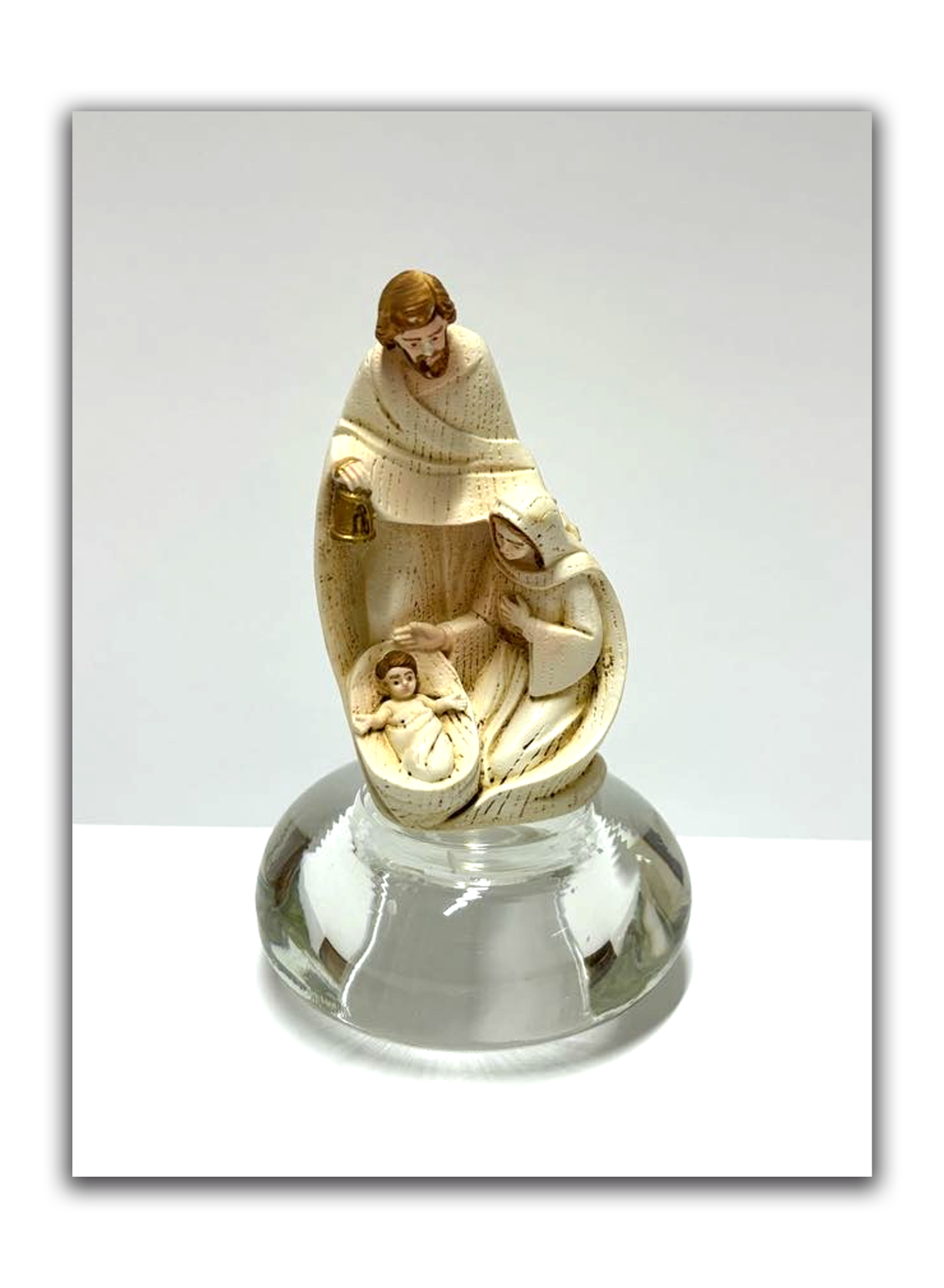 Esta imagem da Sagrada Família apresenta uma escultura em estilo contemporâneo, com formas suaves e um acabamento em tons claros que transmite paz e leveza. José, Maria e o Menino Jesus aparecem unidos em um gesto de cuidado e ternura, em uma composição harmônica e acolhedora.