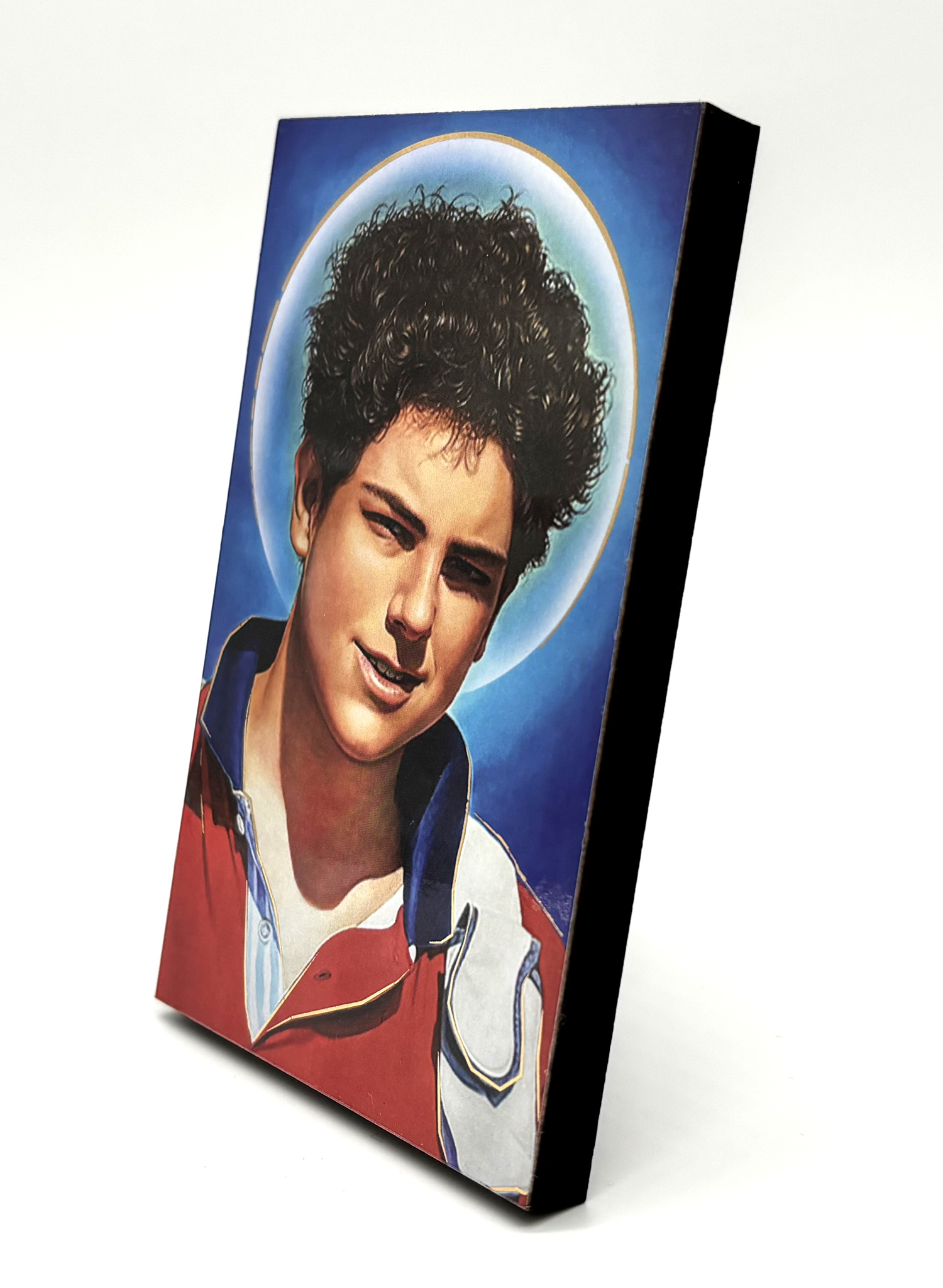 O quadro de São Carlo Acutis, em madeira, distingue-se pela riqueza de detalhe, oferecendo uma presença serena e inspiradora para qualquer espaço. De estilo clássico e acabamento cuidado, é uma peça que convida à oração e à contemplação no quotidiano.
