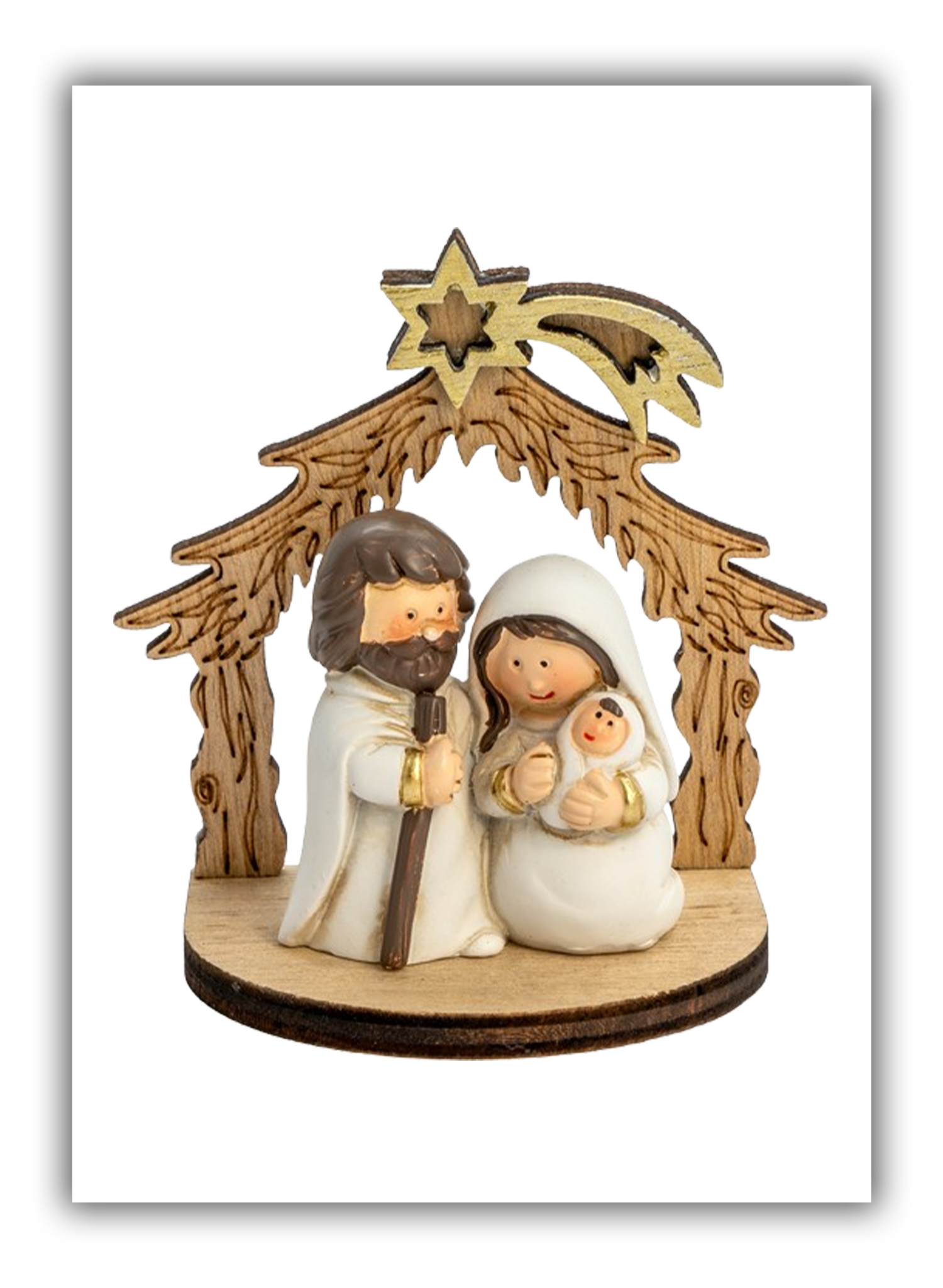 Representando a Sagrada Família sob a estrela de Belém, é perfeito para decorar pequenos espaços, mesas, oratórios ou até oferecer como lembrança de Natal.