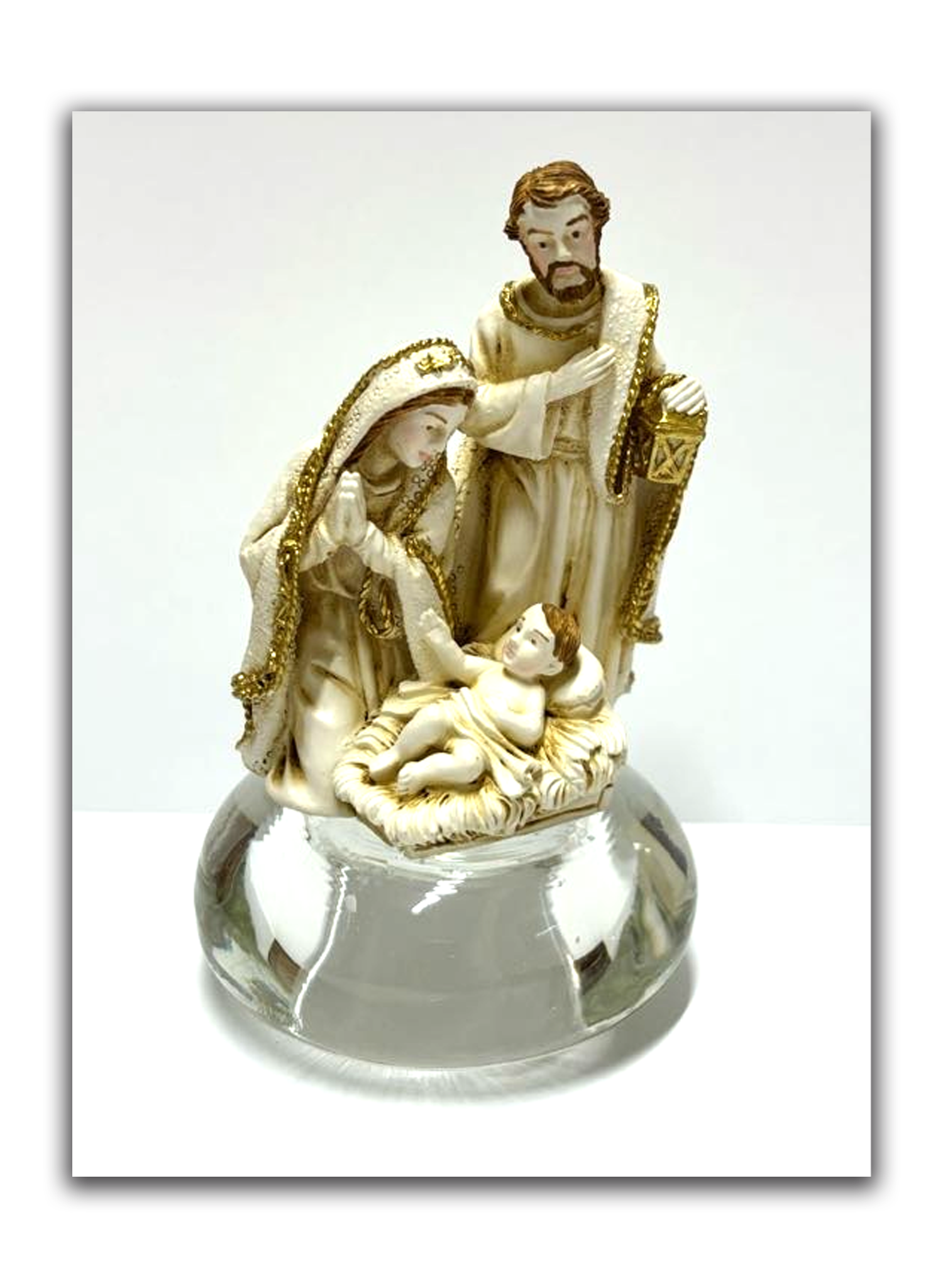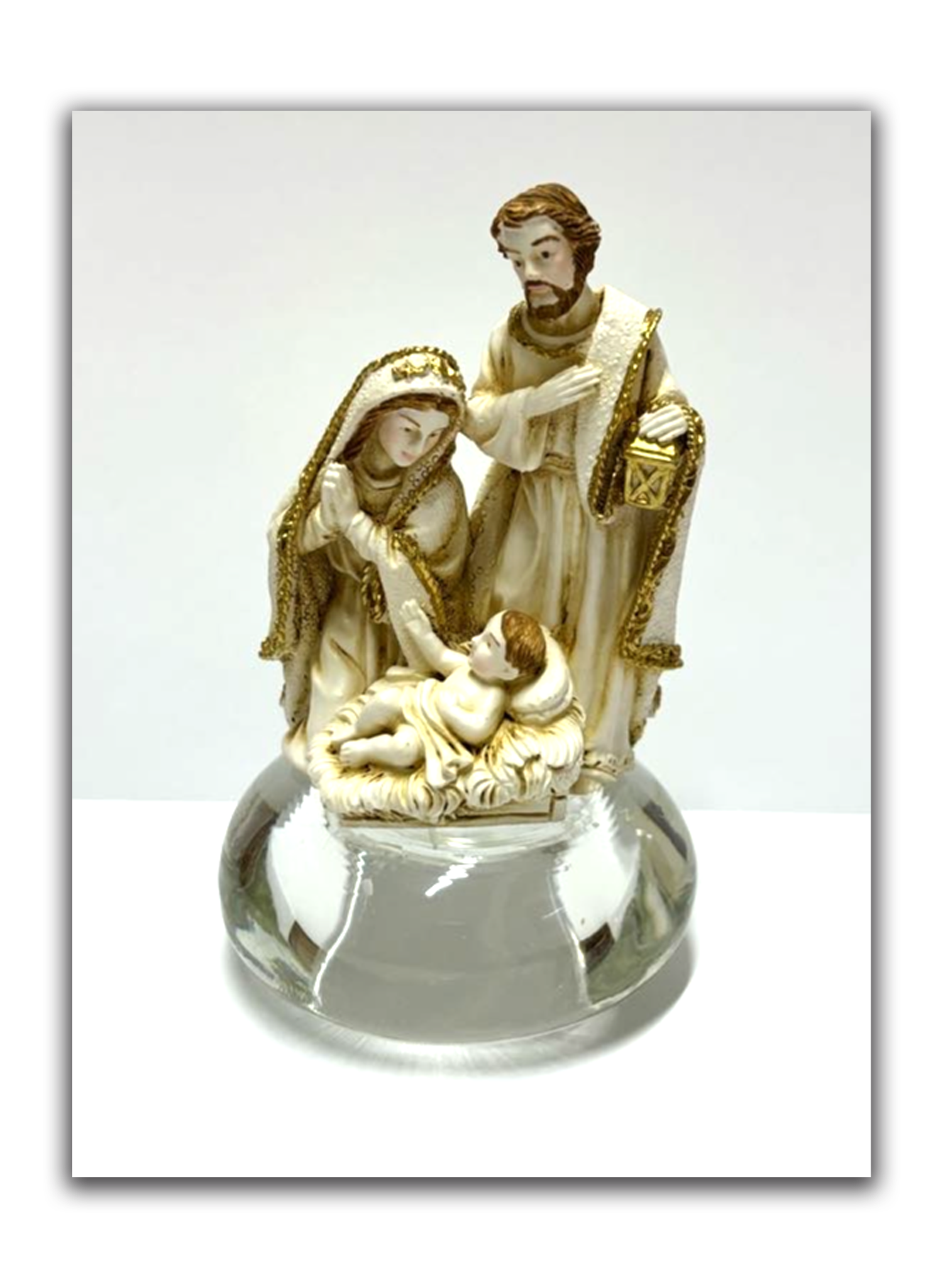A base transparente oferece estabilidade e um toque diferenciado ao conjunto, valorizando ainda mais a cena do nascimento. Seja em um oratório, na mesa da sala ou como parte da decoração natalina, essa imagem transmite paz, proteção e espiritualidade ao ambiente.