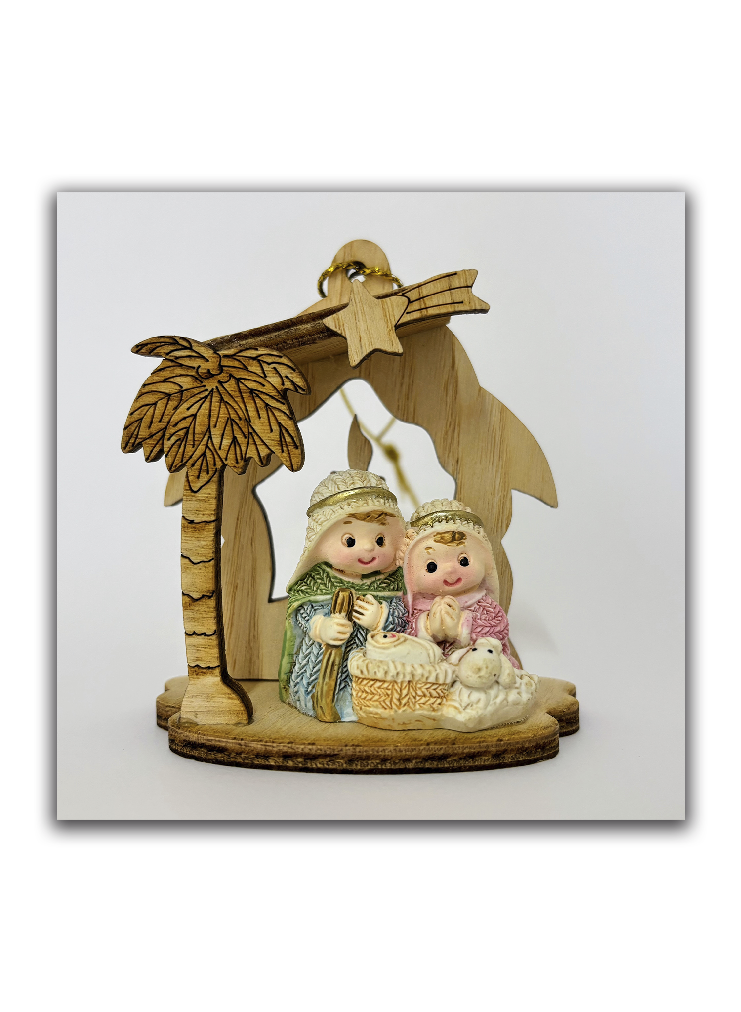 Um enfeite natalício encantador, que combina delicadeza e simplicidade para celebrar o nascimento de Jesus. A peça apresenta a Sagrada Família em estilo infantil, com Maria, José e o Menino Jesus sob um pequeno estábulo em madeira recortada, decorado com estrela e palmeira.