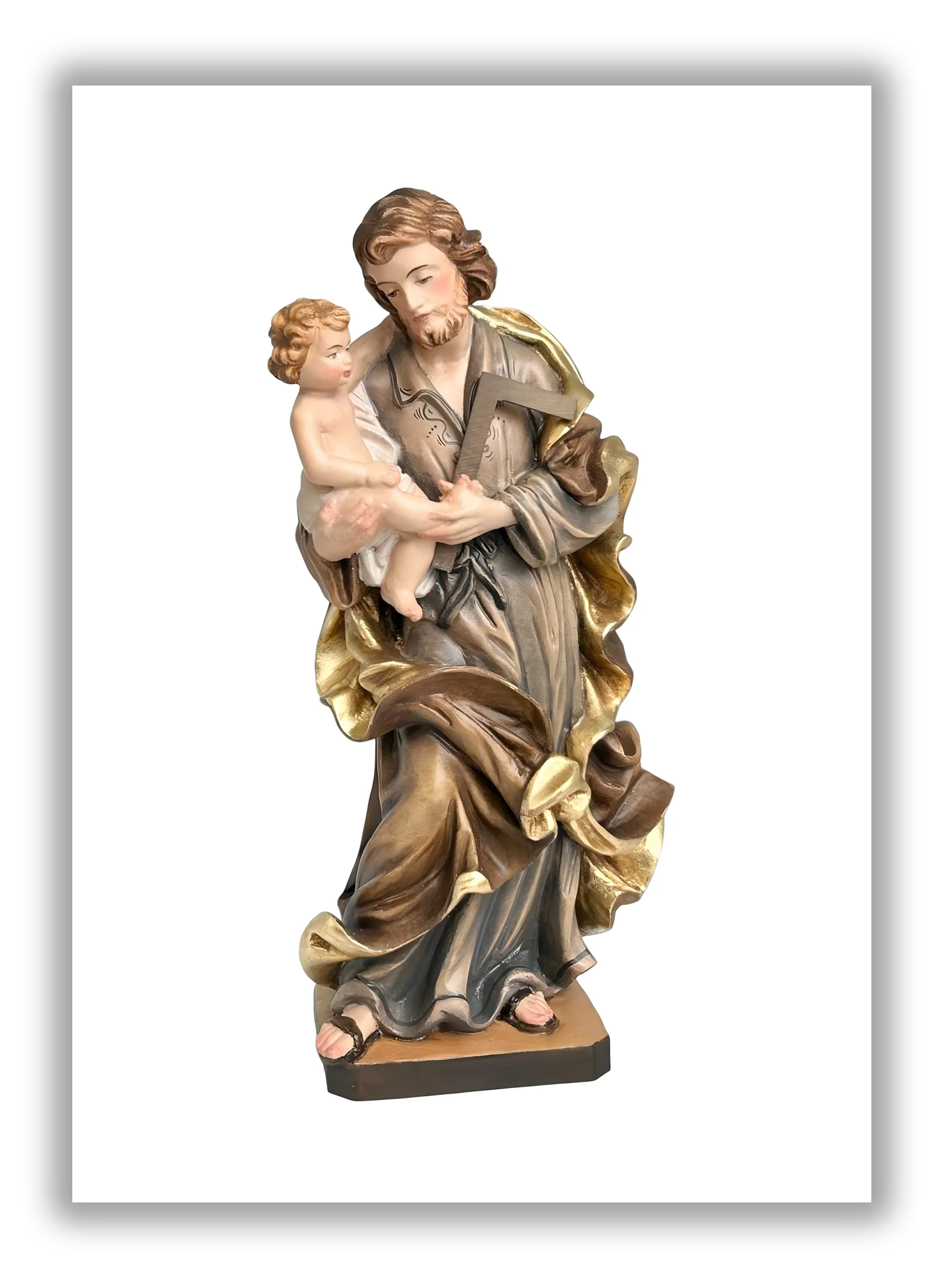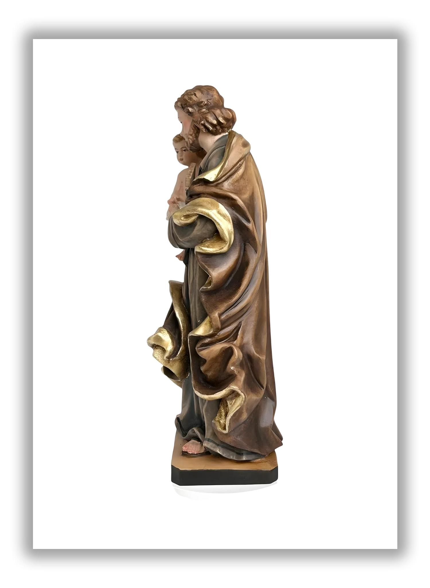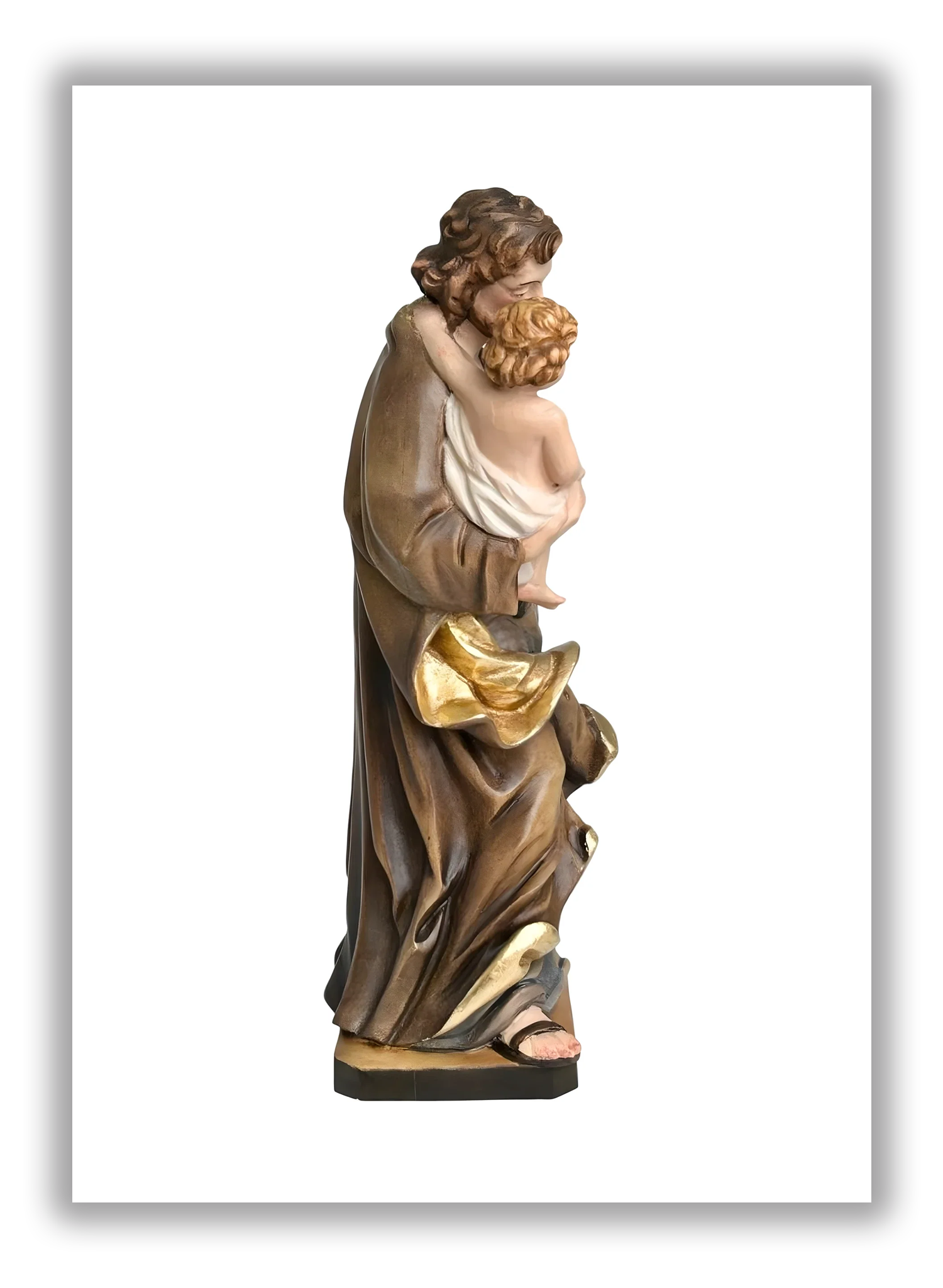 Deixe-se envolver pela serenidade desta escultura, uma obra-prima da talha que captura a terna relação entre São José e o Menino Jesus. O homem, forte e protetor, segura o filho com um gesto de profunda benevolência, enquanto seus olhos baixos refletem uma doce contemplação. A maestria dos artesãos de Val Gardena é evidente nas suntuosas vestes de José, caracterizadas por drapeados volumosos e fluidos , com acabamento em elaborada bainha de folha de ouro ou pintura dourada, que confere à figura um brilho régio e metálico.
