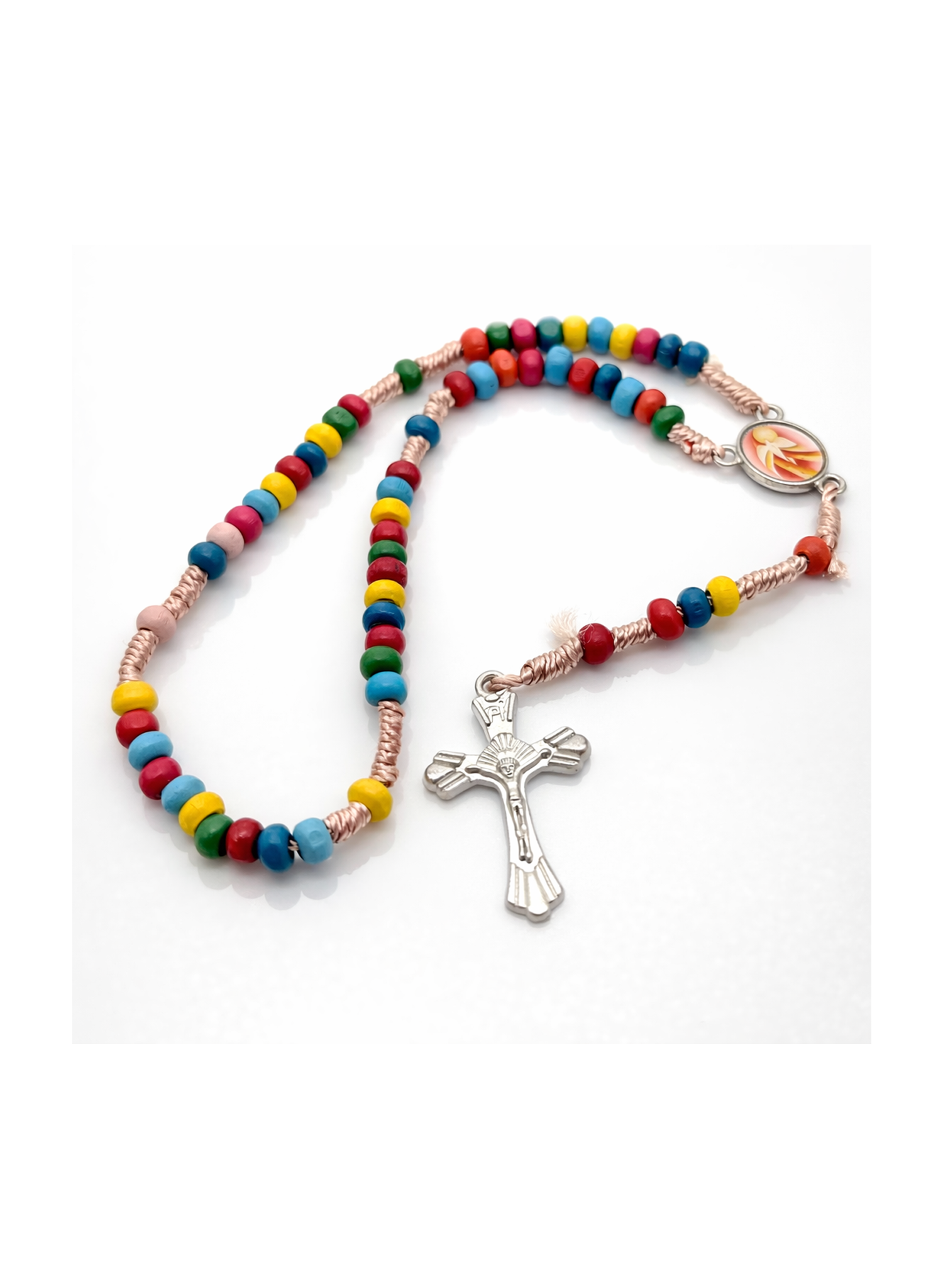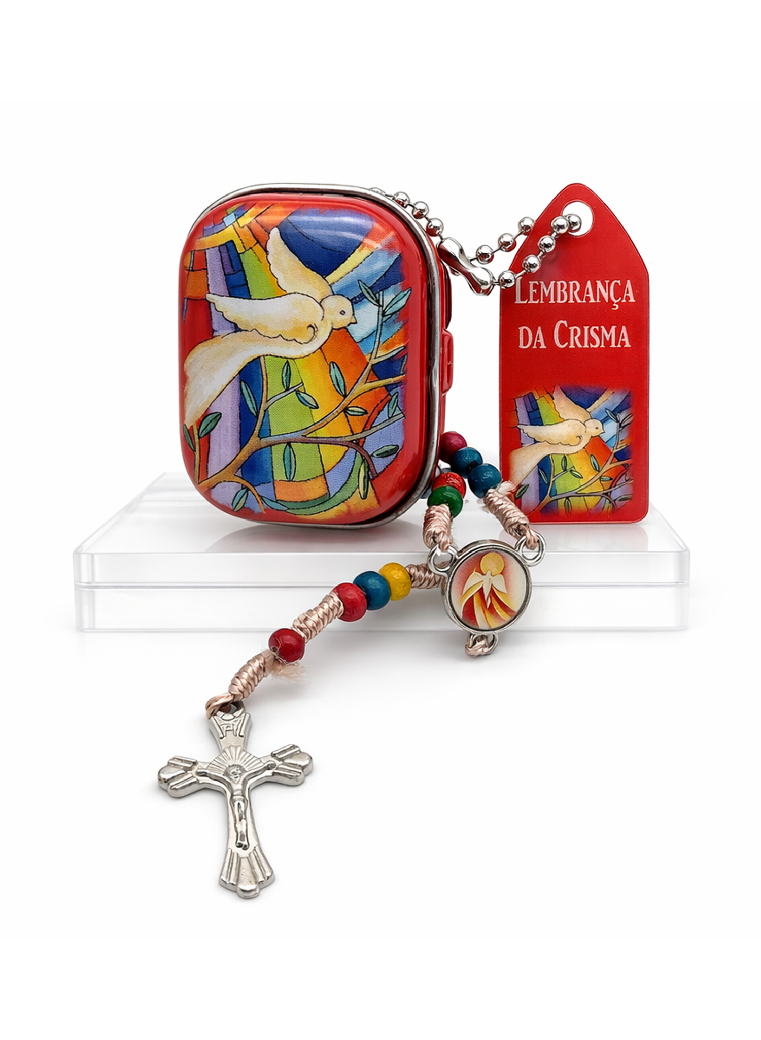 Terço com contas coloridas, especialmente pensado como lembrança significativa do Sacramento da Crisma. As cores vivas evocam a alegria da fé e a ação do Espírito Santo na vida do cristão.